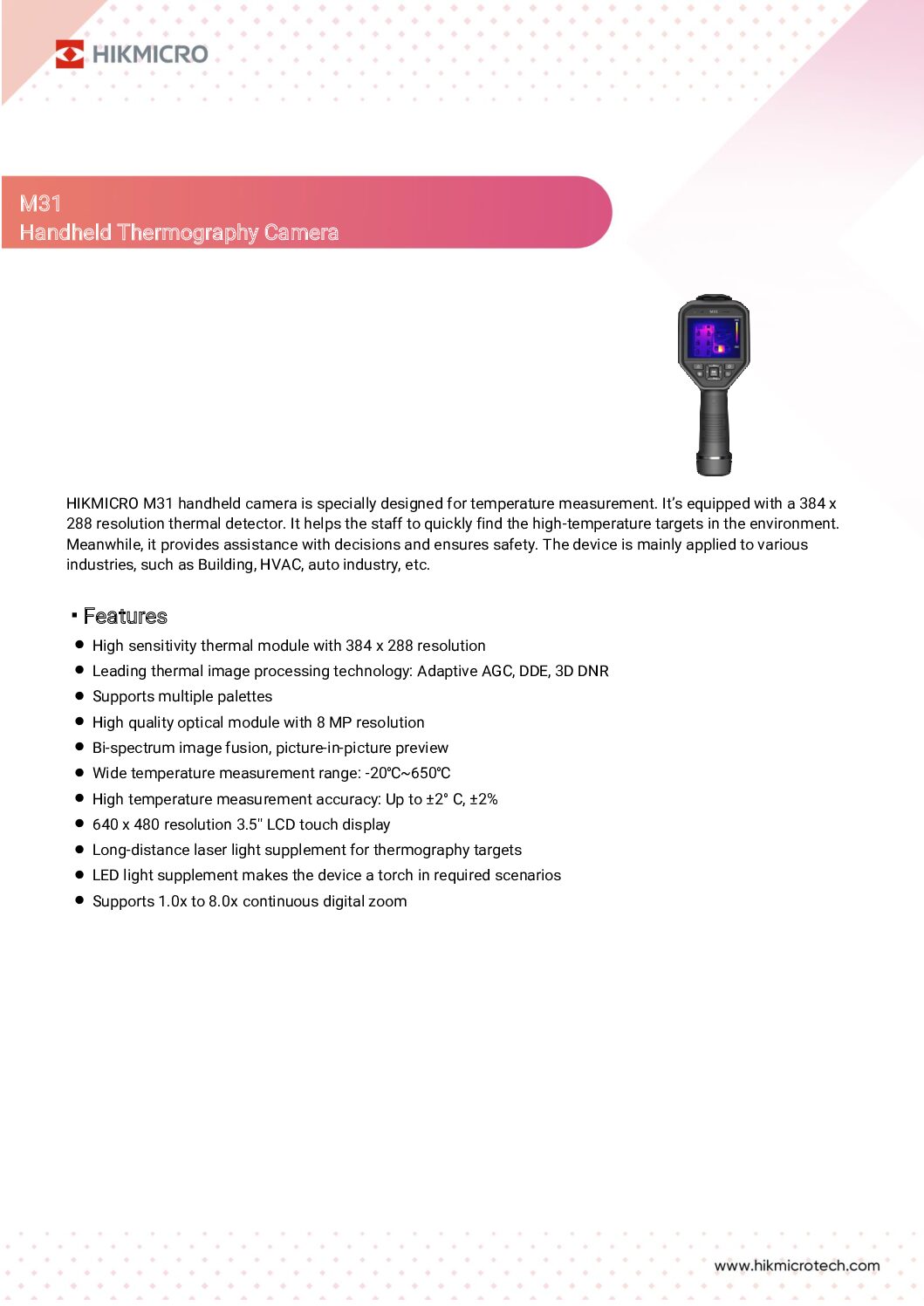 La nouvelle caméra portable HIKMICRO M31 qui vient remplacer la très populaire et appréciée M30 est spécialement conçue pour la mesure de la température. Elle est équipée d’un détecteur thermique d’une résolution de 384 x 288 pixels. Elle permet aux techniciens de détecter rapidement les points à haute température dans l’environnement.